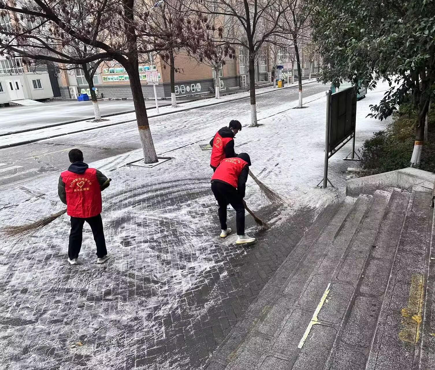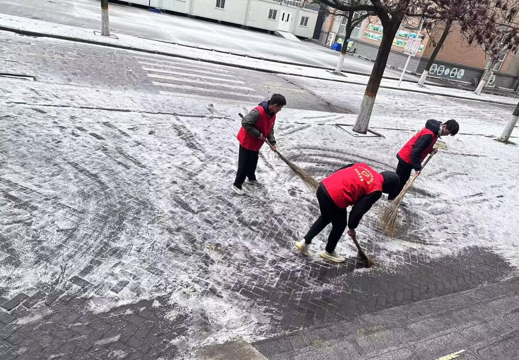 早上7点,尽管天气寒冷,但志愿者已早早地来到了9号宿舍楼。宿舍楼前的楼梯和地面上覆盖了一层积雪和冰,路面十分湿滑。志愿者手持铲雪工具,身穿厚厚的冬装,热情高涨地投入到了清扫积雪的工作中。他们分工明确,有的负责铲雪,有的负责推雪,有的负责清扫地面和楼梯,大家齐心协力,井然有序地进行着工作。在他们的辛勤努力下,9号楼区域的积雪很快就被清理干净。他们的行动不仅保证了师生们的出行安全,也为校园增添了一份冬日的清新和活力。