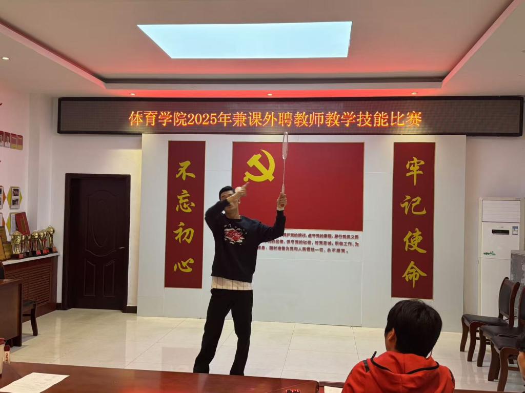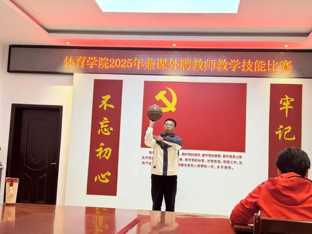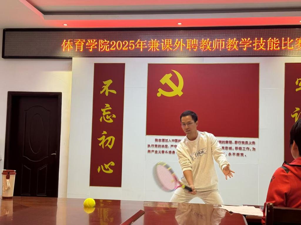比赛现场气氛热烈、秩序井然。来自各专业方向的兼课外聘教师依次登台,按照“15分钟微课教学+5分钟技能展示”的流程展开角逐。微课教学中,教师们围绕篮球、乒乓球、羽毛球、网球等课程内容,精心设计教学环节,通过生动讲解、规范示范和趣味互动,将专业知识与实践操作有机融合,展现出扎实的教学功底与良好的课堂掌控力。